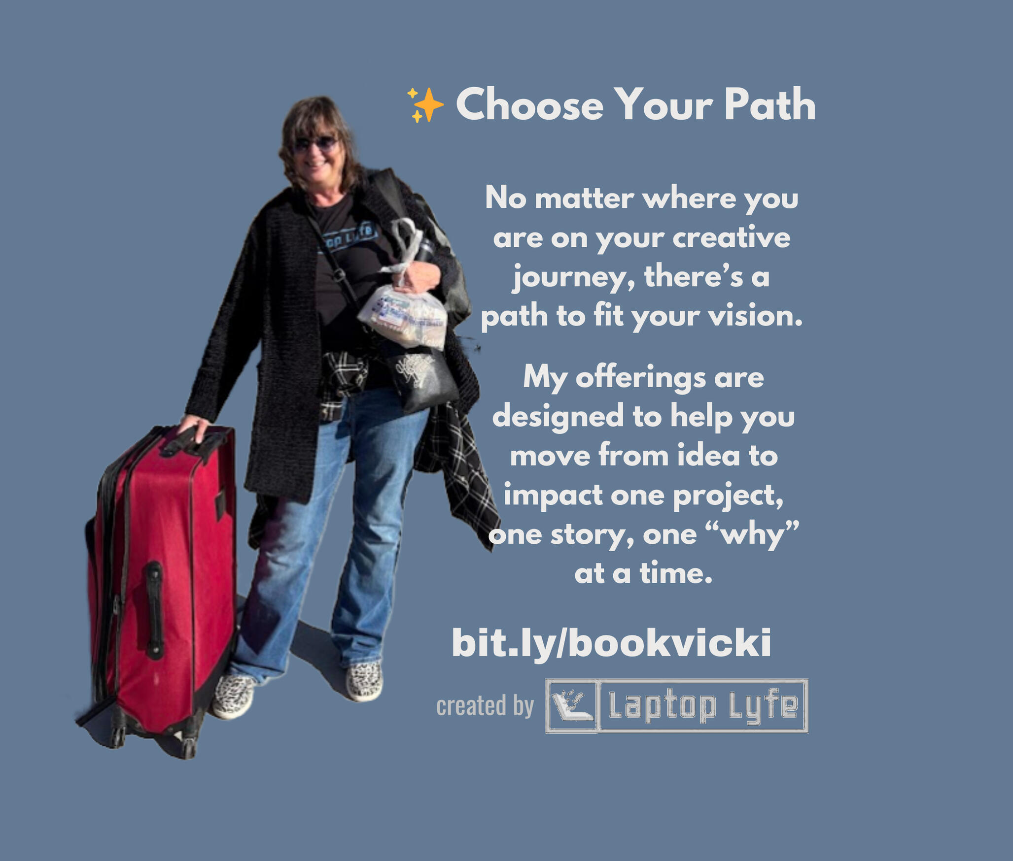 I’m Vicki Conley, founder of Laptop Lyfe and creator of Go Wild Locals™.I help entrepreneurs, community leaders and creatives turn ideas into income through creative self-publishing, print-on-demand merch and collaborative local adventures. Whether you want to publish a keepsake, grow your brand or design a community project, I’ll help you do it with heart, strategy and a little wanderlust.